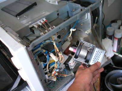 そのしくみは、手に持っている「マグネトロン」と言う電波を出す部品があるからです。この先が出ているところから「高周波」非常に大変強い電波