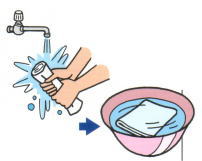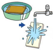 ![]() ●まな板の洗浄に 汚れなどを落とした後に衛生水に 1〜2分間浸け置き、水道水で 洗います。 |