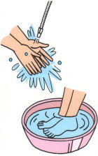 ![]() ●足裏・足のお 手入れに 衛生水を洗面器など にためて、1〜2分間 浸してください。 |